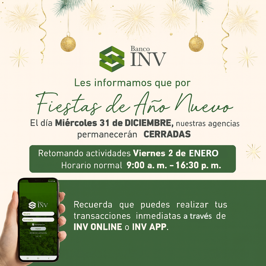 Banco INV, informa que nuestras oficinas permanecerán cerradas el día miércoles 31 de diciembre, por Fiestas de Año Nuevo. Regresando a horario normal el día viernes 2 de enero 2026.